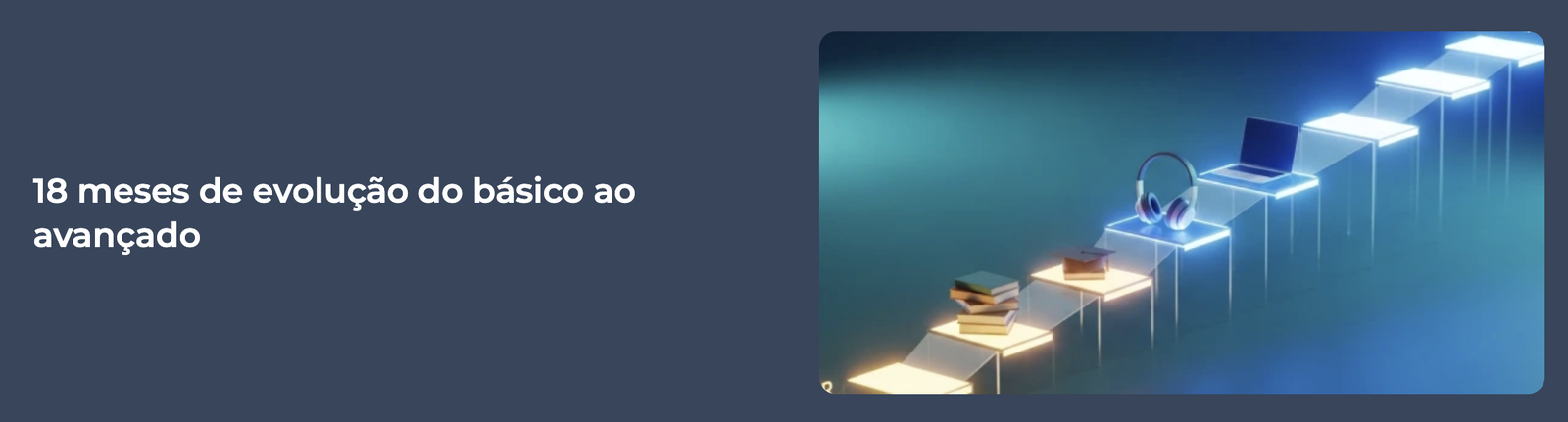 Durante 18 meses, você será guiado em uma jornada estruturada do nível básico ao avançado, com aulas ao vivo e uma plataforma online completa para acelerar seu aprendizado.